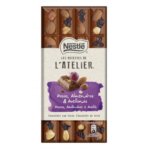 Tableta de chocolate con leche de Nestlé Les RECETTES de L’ATELIER que envuelve delicadas almendras y avellanas enteras tostadas con dulces uvas pasas.